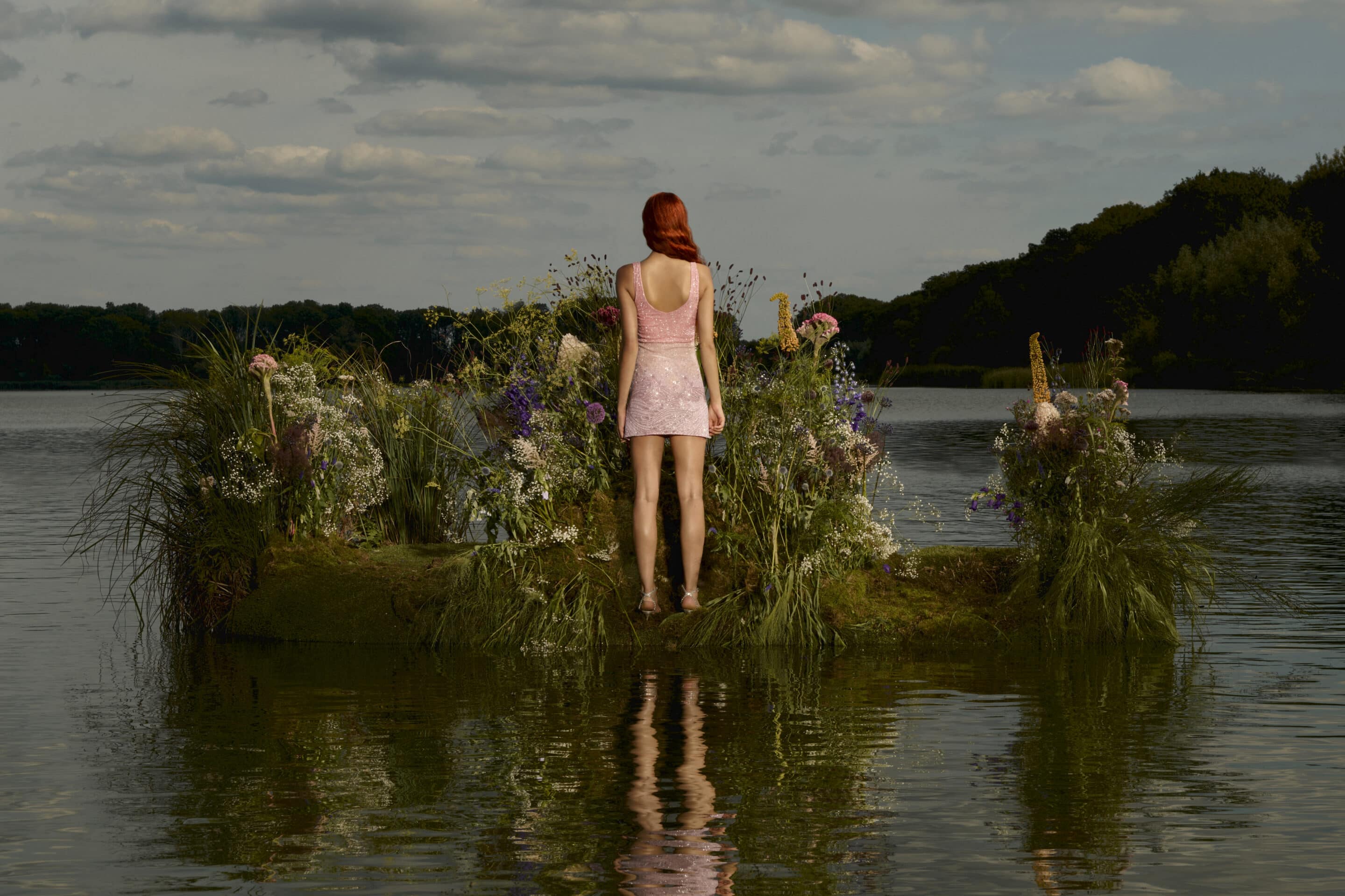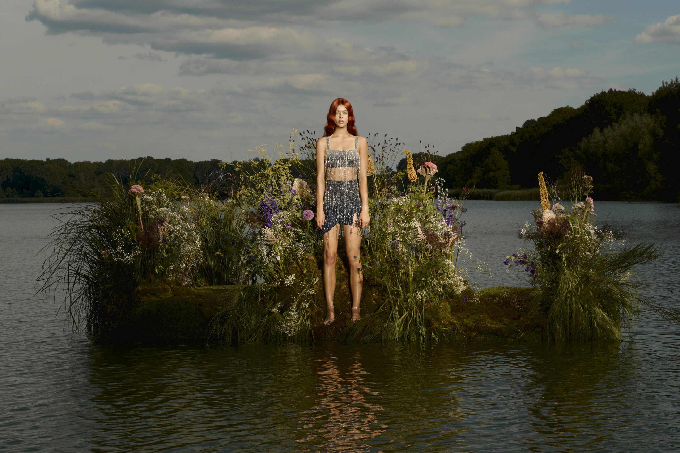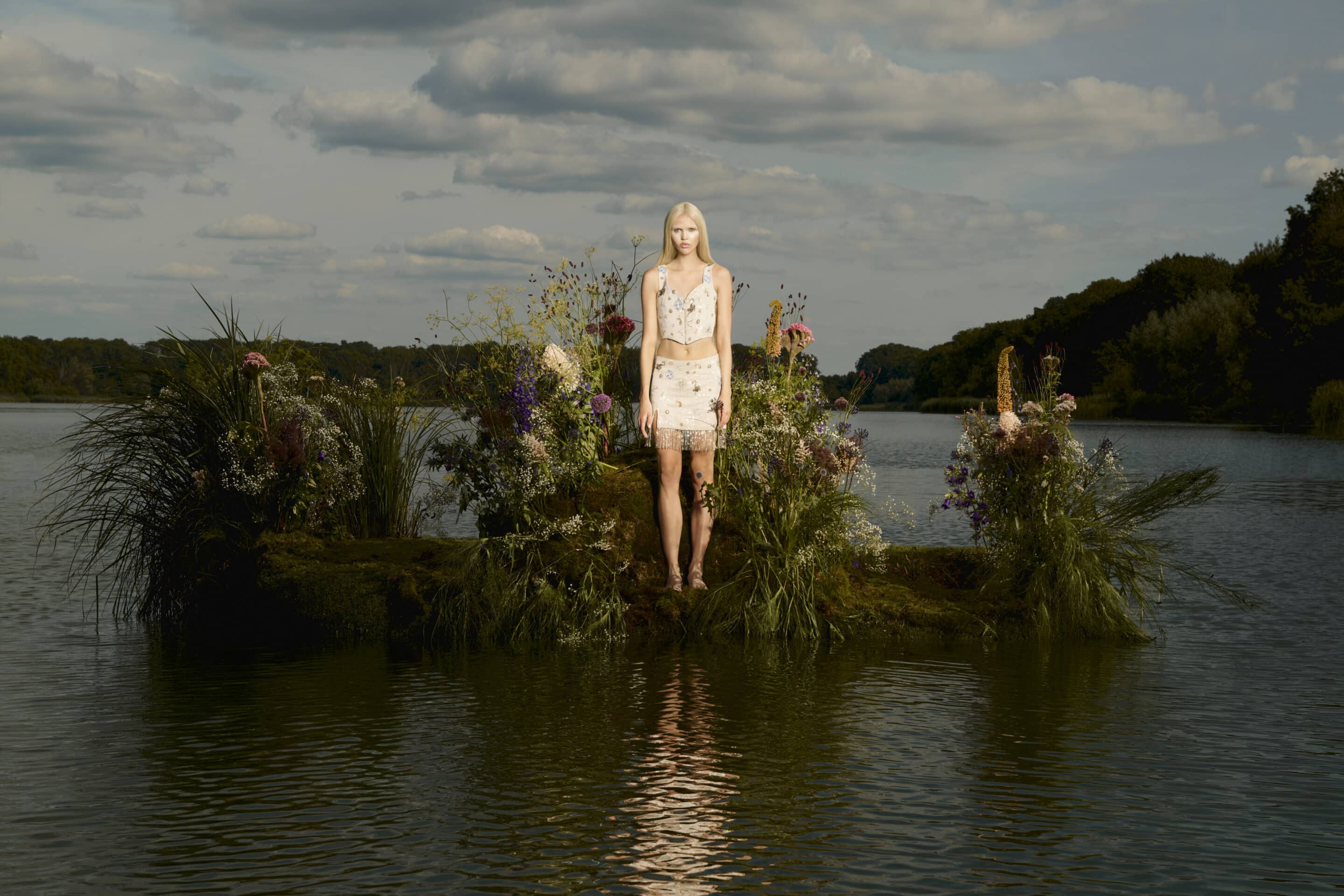 Set on a flower-covered island in the stillness of a lake, the imagery presents modern sirens as sovereign figures rather than mythical temptresses.