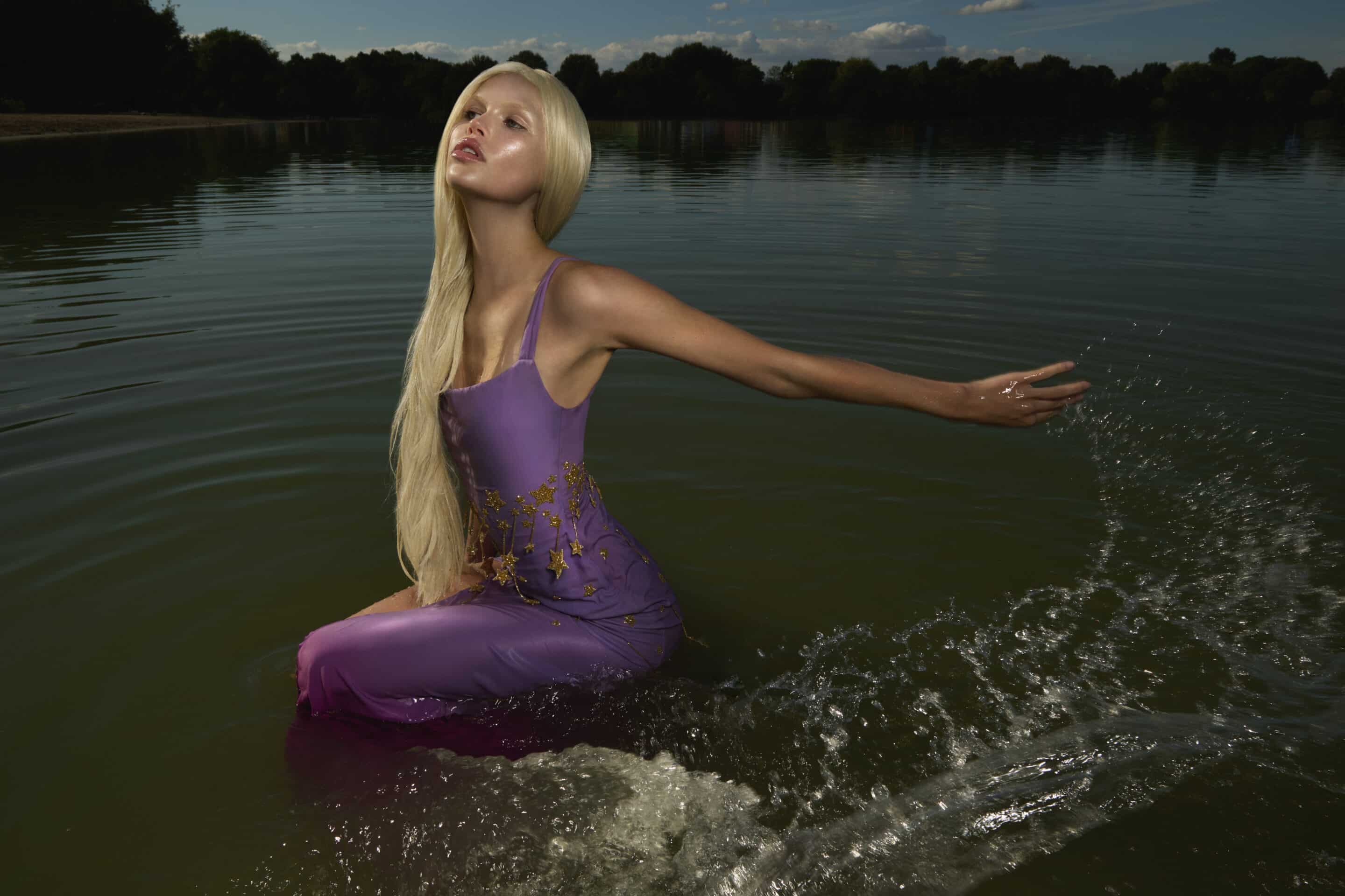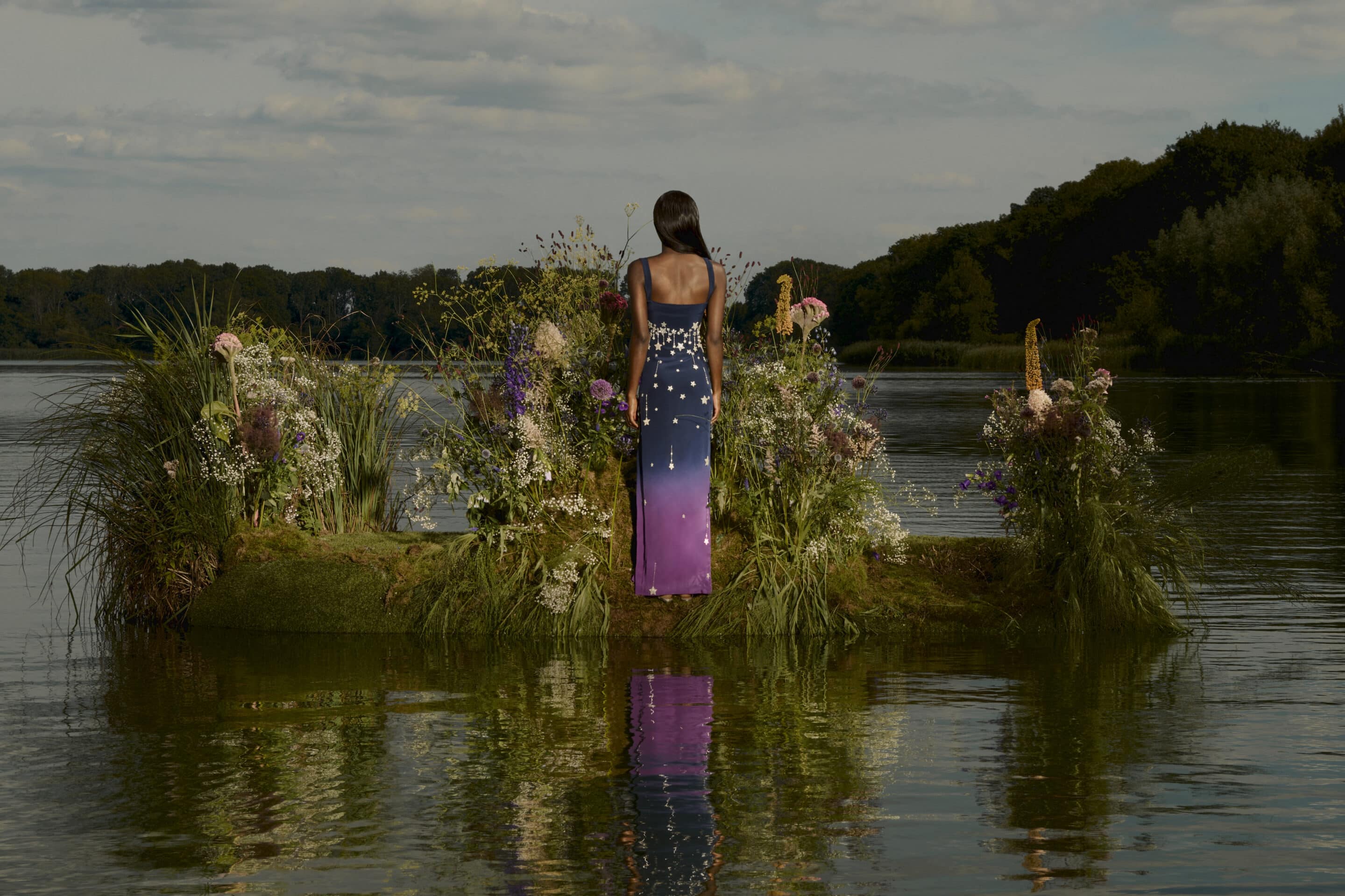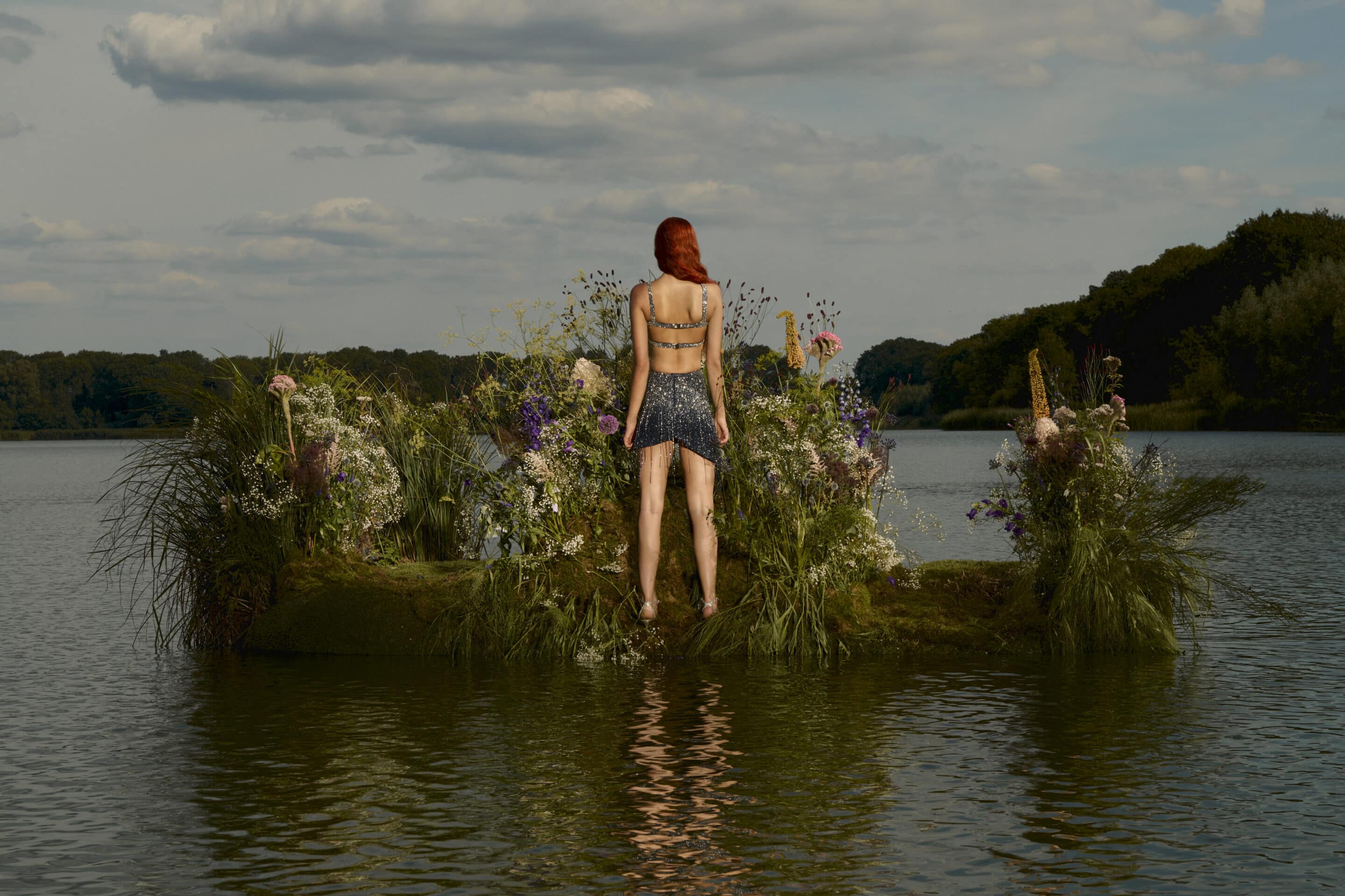 Set on a flower-covered island in the stillness of a lake, the imagery presents modern sirens as sovereign figures rather than mythical temptresses.